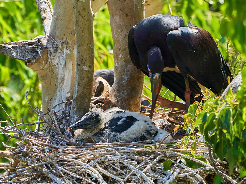 Es la más pequeña de las cigüeñas y la hembra es ligeramente más pequeña que el macho. Anida en árboles, acantilados, techos de casas y por lo general utilizan el mismo nido año tras año hasta que este colapsa y construye otro.